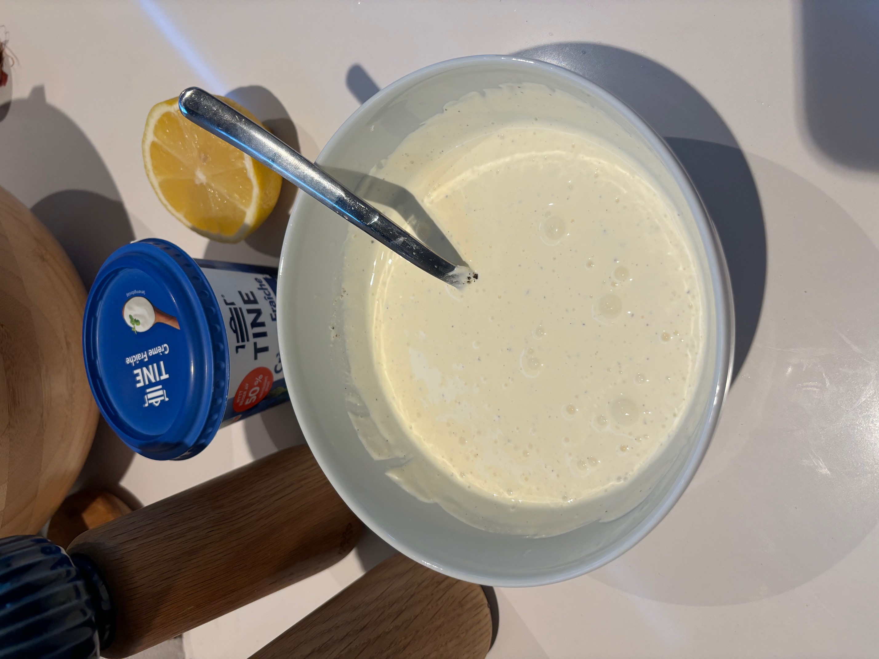 Bland sammen crème fraîche (1 boks), saften fra sitron (0.25 stk), salt (0.5 ts) og pepper (0.25 ts) i en bolle.