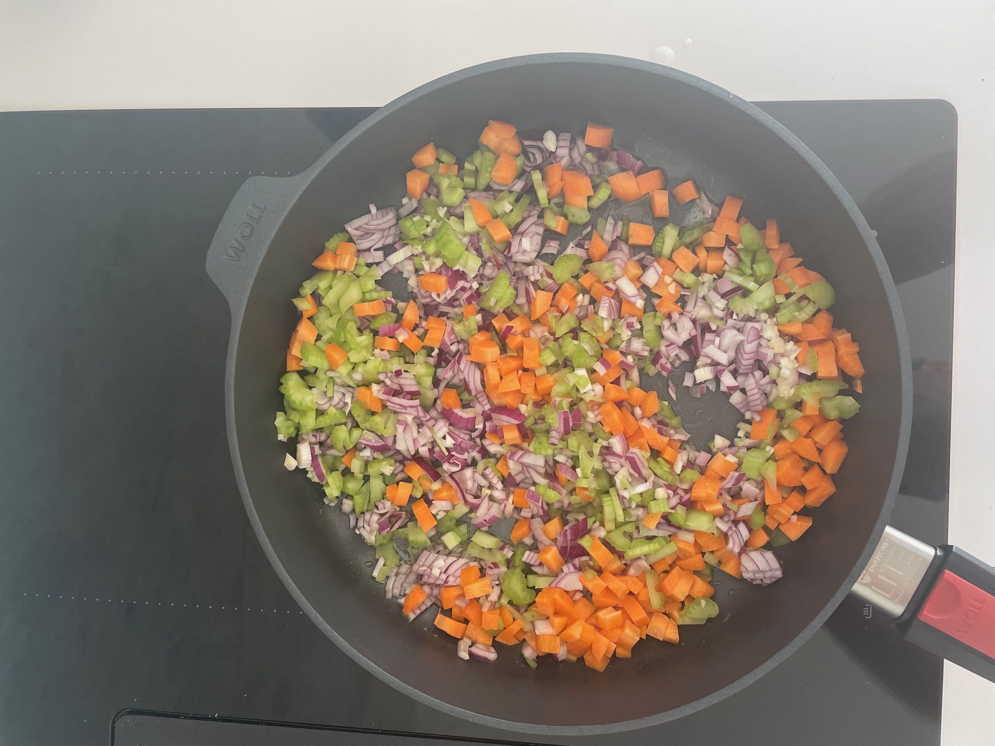 Fres rødløk, stangselleri, hvitløk og gulrot i et par spiseskjeer smør på høy varme til mykt.